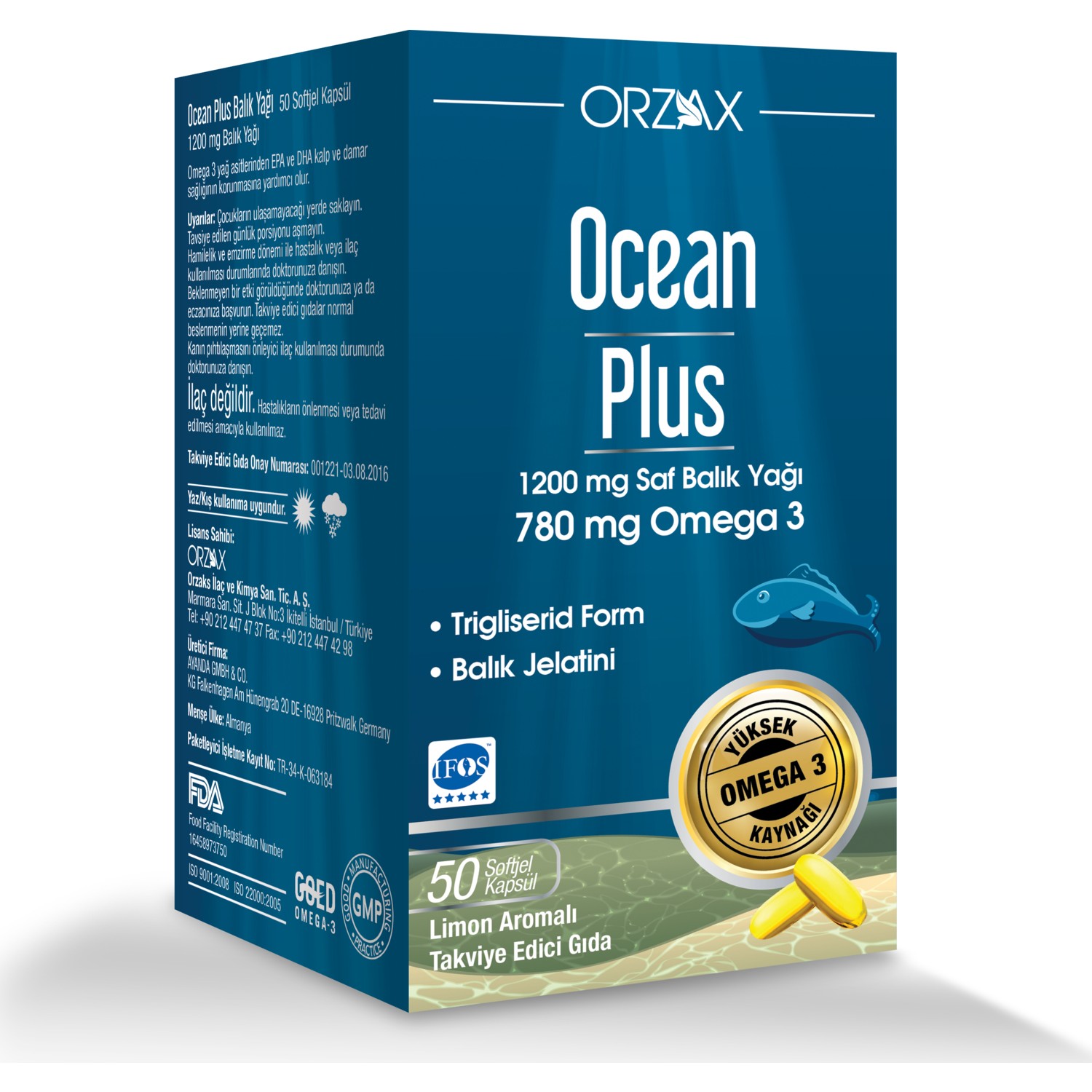 Ocean'ın Omega-3 Asitleri gün boyu sağlıklı kalmanızı sağlayarak kardiyovasküler, yüksek tansiyon ve kolesterol gibi hastalıklara karşı koruma sağlar. Vücudun ihtiyaç duyduğu besin maddelerini dış kaynaklardan takviye eden balık yağı, herhangi bir kimyasal içermez. Ocean, ağır metallerden uzak, temiz ve soğuk suda yetiştirilen küçük balıklardan elde edilen yağı kullanır. Dünya Sağlık Örgütü ve bağımsız kuruluşların Uluslararası Balık Yağı Standartları tarafından analiz edilmiş ve onaylanmıştır.